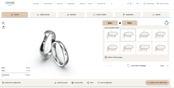 Gerne können Sie Ihrer Kreativität freien Lauf lassen und Ihre Ringe auch selber gestalten. Mit dem Trauring-Konfigurator der Firma Fischer gestalten Sie Ihre Trauringe entspannt bei sich Zuhause.